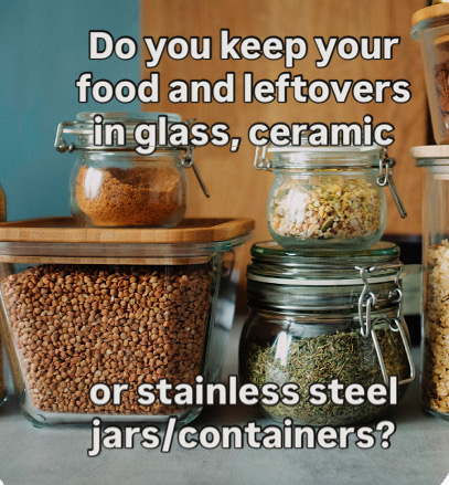 Keep your food, whether fresh, dried, or leftover, from plastic. Use glass, ceramic, wooden or stainless steel jars, bowls and containers that don’t shed microplastics.