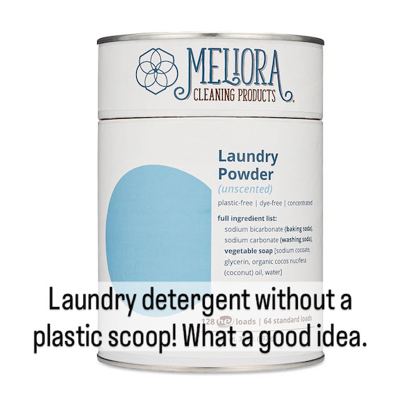 To move away from detergent in plastic bottles, I’ve tried laundry sheets — still contain plastic, tablets — may be unscented but contains chemicals to mask odors. Pods are coated with a plastic called polyvinyl Alcohol (PVA). I’ve now moved back to a laundry powder that has no plastic whatsoever, not even in their packaging. Meliora provides a stainless steel scoop, reusable paper and steel canister, and their scented versions are made from organic essential oils.