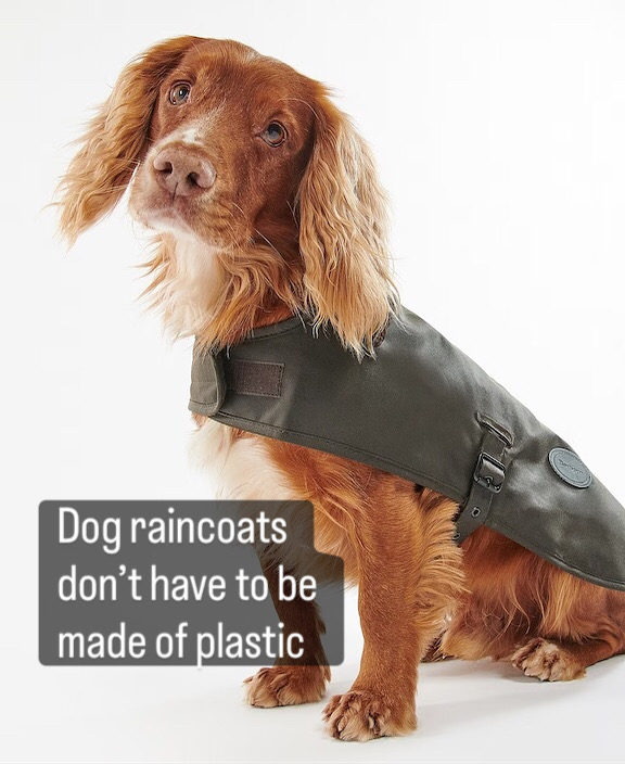 Did you know that raincoats don’t have to be plastic? This raincoat is made of waxed cotton. It keeps the dog dry even in heavy rain.