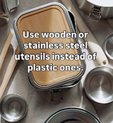 Use wooden spoons, stainless steel mixing bowls and whisks, ladles. Avoid using plastic utensils for cooking so that microplastics won’t get into your food.