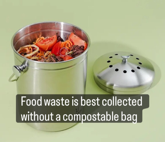 Your food waste should be collected in a non-plastic bin, so no microplastics will leach into it when a commercial facility turns it into fertilizer. I put mine in stain-less steel mixng bowls in the freezer until I can walk over to the village compost bins. You really don’t need a ompost bag liner because all compostable bags contain an oil-based polymer in addition to the plant-based PLA and starch. Compostable bags have even more additives, phthalates, and flame retardants than conventional plastic bags. So it’s best not to use ANY bags to line your food waste collection.